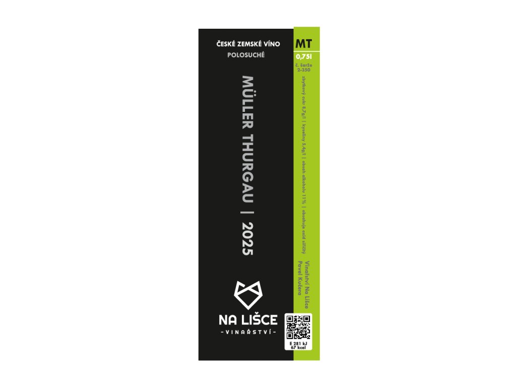 Lehký polosuchý Müller Thurgau s jemnou ovocností, svěžím projevem a velmi dobrou pitelností. Působí čistě, vyváženě a nenuceně, ideální na sklenku i delší posezení.
